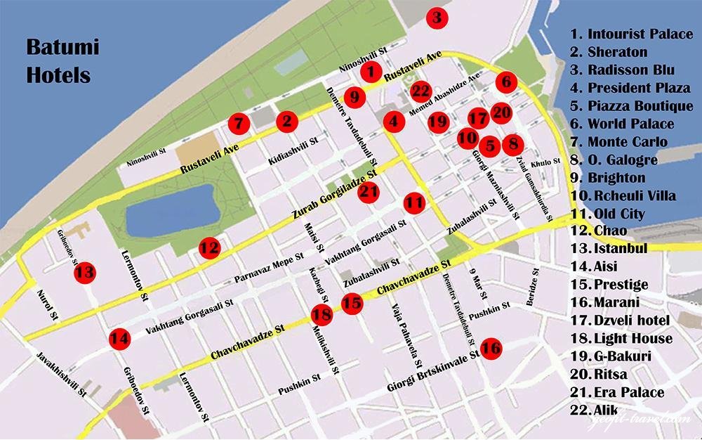 Предоставленная карта с достопримечательностями Батуми — с фотографиями и названиями, описаниями позволяет составить собственный маршрут, который можно сжать до трех дней или растянуть на неделю. Город Батуми атмосферный, он пронизан духом истории, но вместе с тем приобретает и европейский облик.Поэтому он решает, что посмотреть в Батуми, стоит обратить внимание и на старинные постройки, и на новодель.