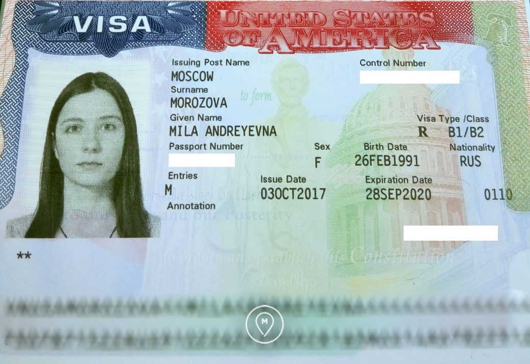 Нередки случаи, когда визовые офицеры делают ошибки в написании имен или особенно отчеств. Если в имени сделано не более трех ошибок, то визу возможно не переклеивать. Однако, все же, лучше, чтобы их не было. - Количество въездов в страну указано либо буквой “M”, что означает многократный въезд (multiple entries), либо цифрами, когда идет ограничение в количествах въездов до одного или двух раз. Такие случаи не редкость и часто касаются учебных, студенческих или бизнес виз, когда человек совершает поездку в США с конкретной целью (научная конференция, учеба, бизнес встреча с партнерами, выступления на конференции и тд).