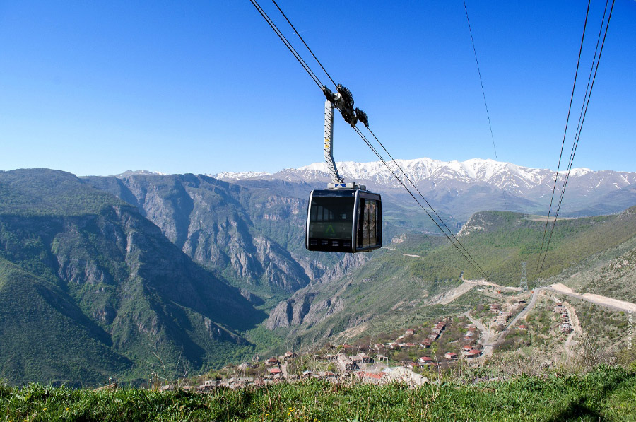 Подниматься к комплексу нужно на «Крыльях Татева» — это самая длинная пассажирская канатная дорога в мире, построил ее фонд IDeA. Путь проходит среди высоких гор, над ущельем бурной реки Воротан. Обычно там выстраиваются большие очереди, поэтому нужно приезжать либо рано утром, либо заранее купить билет — и тогда можно выбрать любое время. После того как осмотрите все достопримечательности, можно посидеть над обрывом и понаблюдать за орлами.